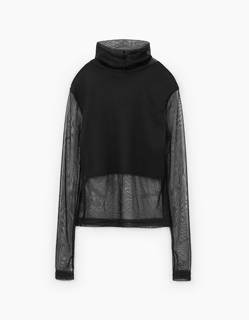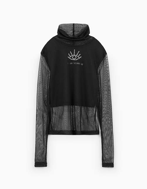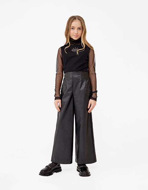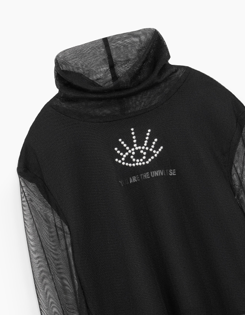 Чёрный нарядный лонгслив из сетки для девочки. Модель полуприлегающего силуэта. Узкий рукав. Изделие с нижним укороченным нераздельным топом из кулирной глади. Лонгслив декорирован авторской композицией из страз.