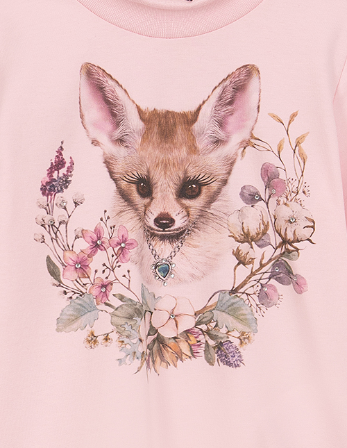 Нежный светло-розовый лонгслив для девочки. Модель прямого силуэта. Изделие с воротником-стойкой из рибаны. Лонгслив декорирован стразами и авторским принтом.