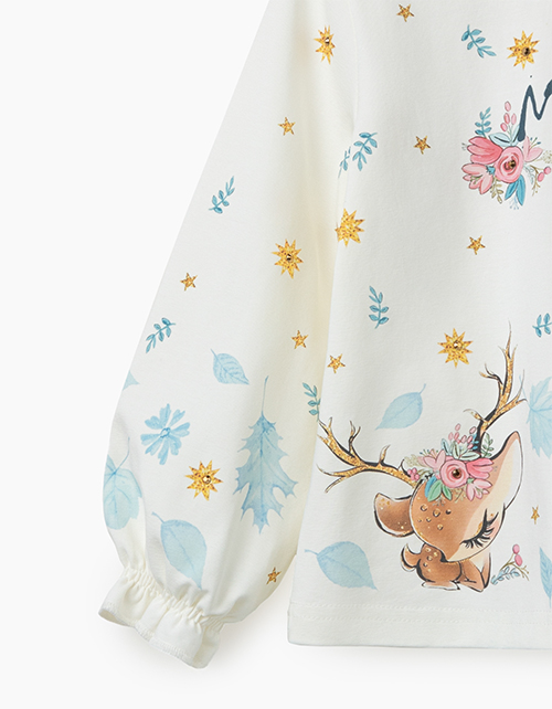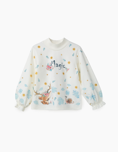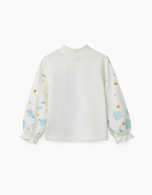 Джемпер молочного цвета из кулирной глади с начесом. С эластаном. Длинный рукав с рюшами по низу. Украшен акварельным принтом и золотыми пайетками. Горловина-стойка из рибаны.