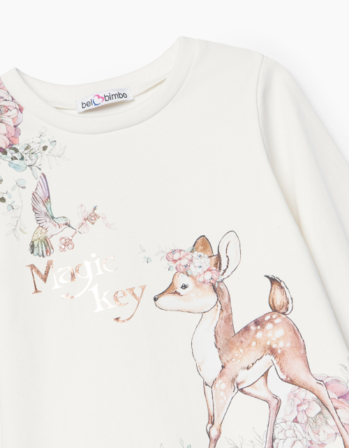 Молочный лонгслив с принтом и стразами для девочки. С отделкой из мягкой рибаны по горловине. Декорирован изображением олененка, цветочным мотивом, радужными стразами и аппликацией из фольги. Подойдет для создания романтичного образа.