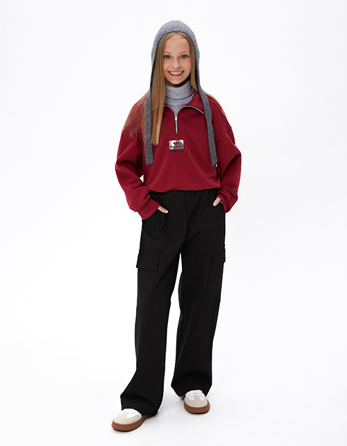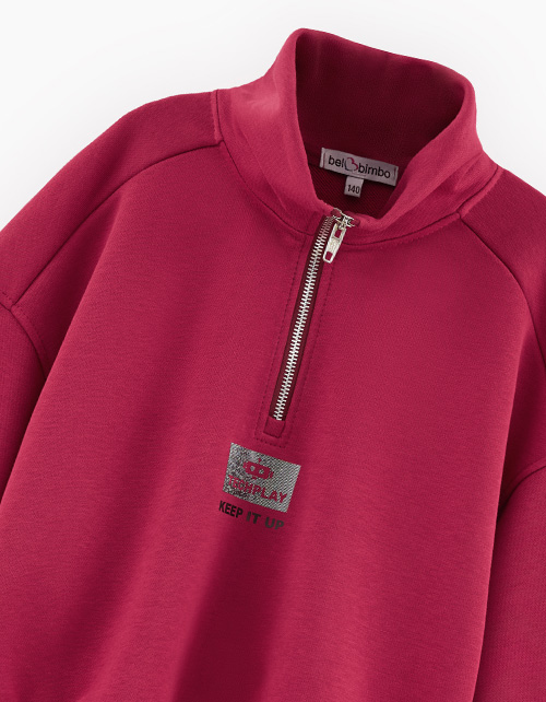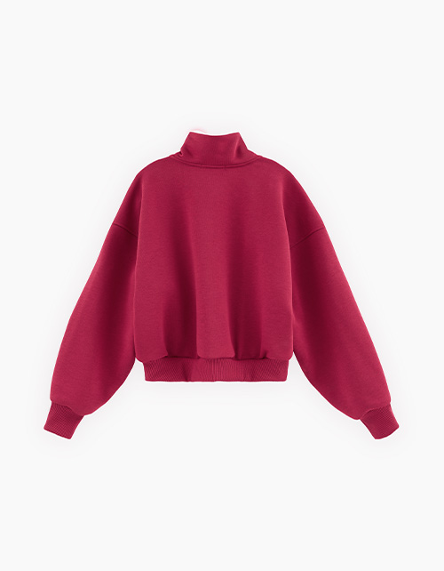 Укороченный свитшот оттенка гранатовый сок. Модель прямого объёмного силуэта. Спущенная линия плеча. Воротник стойка с застёжкой на молнию по типу олимпийки. Манжеты и низ изделия из рибаны. Изделие декорировано авторской печатью и мотивационной фразой.