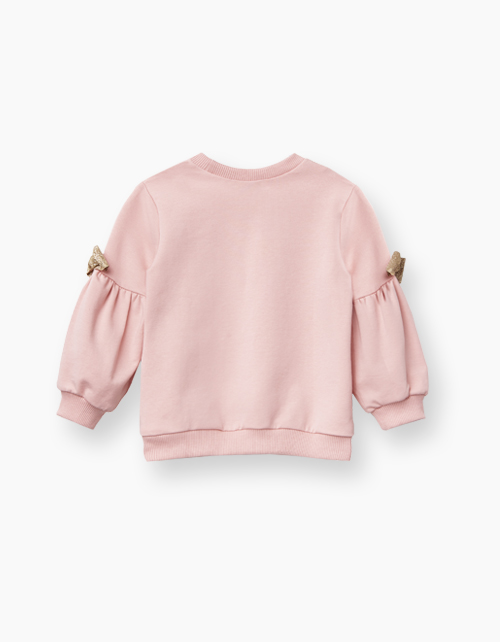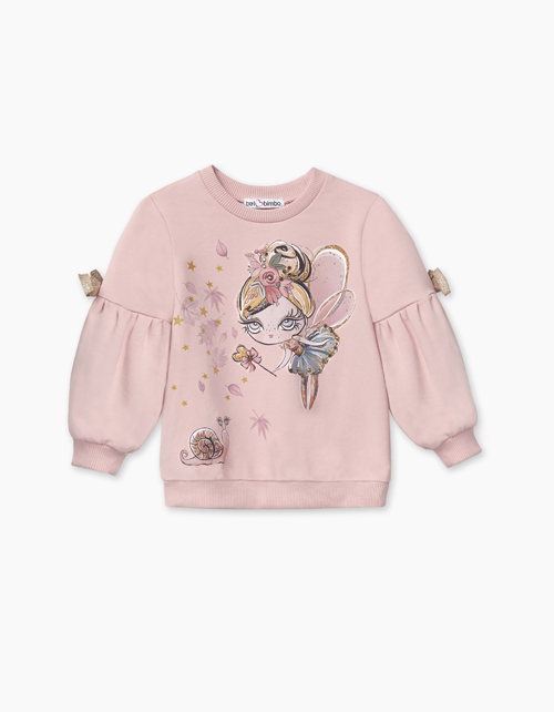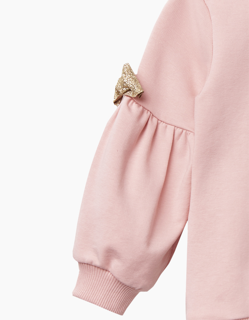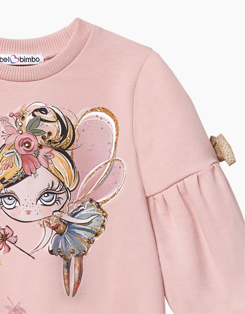 Пепельно-розовый джемпер из футера эластаном. Горловина и манжеты из рибаны. Длинные рукава с подрезами украшены золотыми бантами. Принт в виде феи и золотых звезд спереди