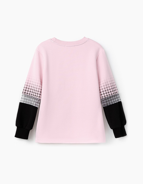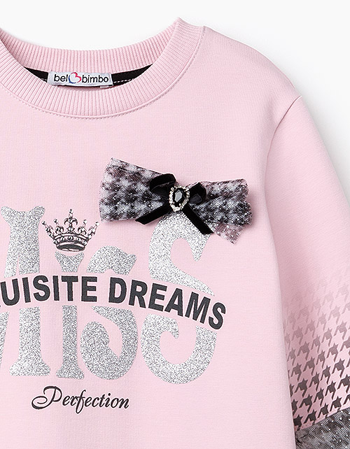 Джемпер прямого силуэта для девочки. Основная ткань - футер розового цвета, со вставками из черного и принтованного полотна в "гусиную лапку". Декорирован трафаретной печатью и сложным бантом со стразами