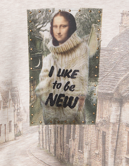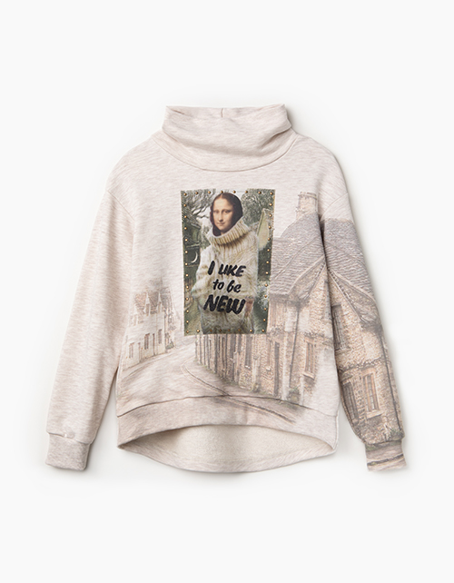 Свитшот с удлиненной спинкой для девочки. Из бежевого меланжевого футера и рибаны. Мягкая горловина-стойка с драпировкой создает ощущение уюта. Принт-коллаж, переходящий с полочки на рукав, добавляет модели шарма