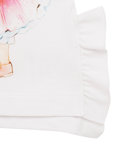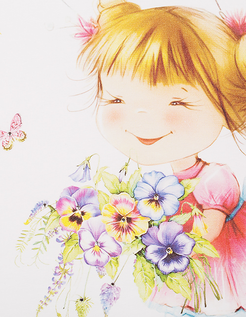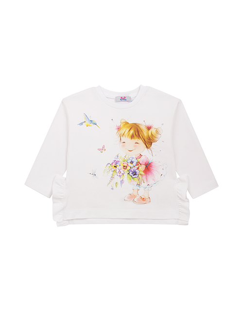Милая и комфортная кофточка станет поводом для многочисленных улыбок Вашей малышки! Трогательный принт с изображением прелестной девочки с ярким букетом цветов и парящими колибри, свободный силуэт, украшенный по бокам рюшами, создают очаровательный обра