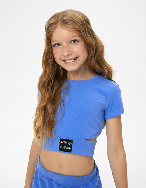 Стильный лазурный топ для девочки. Укороченная модель прилегающего силуэта. Изделие с декоративными разрезами по бокам. Топ декорирован вышивкой.