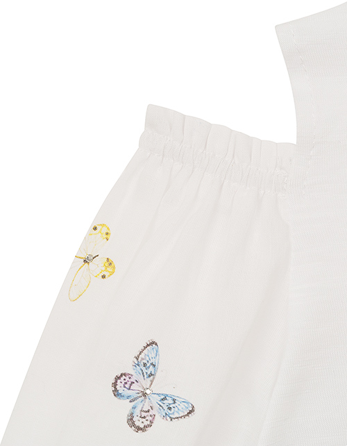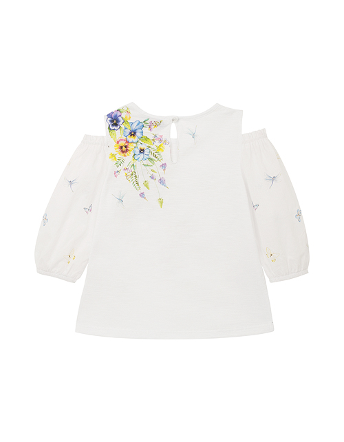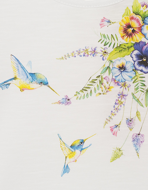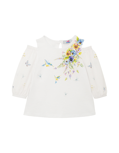 Легкая и нежная блузка из приятной натуральной ткани, просто необходима маленькой девочке жарким летом! Очаровательный образ с открытыми плечиками, трогательными рюшами и принтом с яркими цветочками и милыми колибри, приведёт всех в восторг