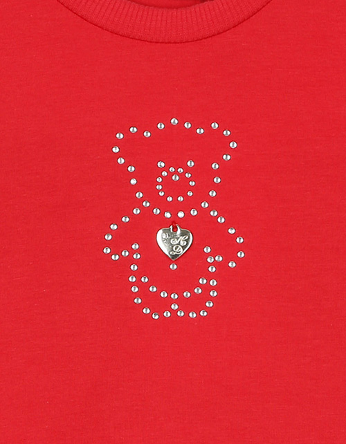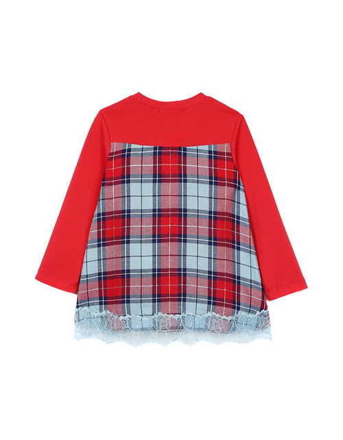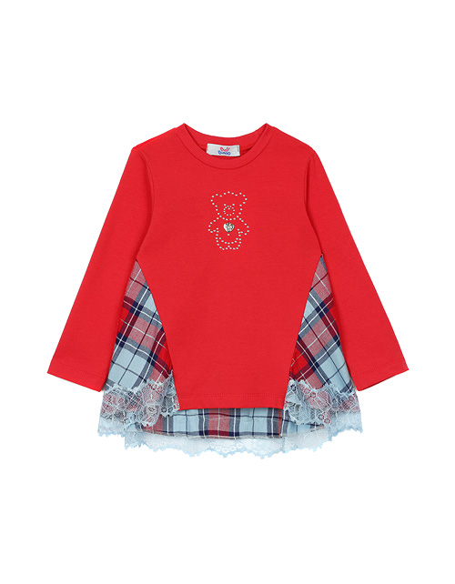 Джемпер для девочки со вставками из ткани в клетку дополнен вышивкой стразами в виде мишки и кружевом по низу изделия. Джемпер свободного силуэта имеет круглый вырез горловины. Изделие пошито из трикотажного полотна с отделкой из плательной ткани.