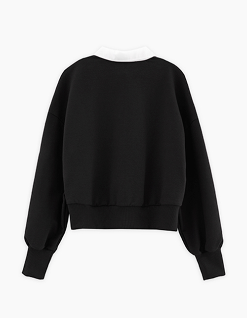Укороченный джемпер-обманка для девочки. Модель прямого силуэта. Слегка спущенная линия плеча. Имитирует комплект из белой блузы и чёрного кардигана с декоративной застёжкой на пуговицы. Выполнен из футера и сорочечной ткани. Удобная застежка на кнопки.