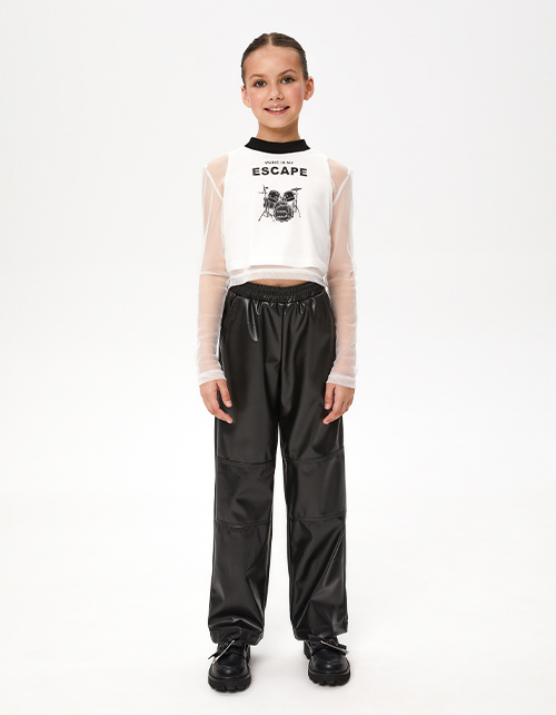 Укороченный лонгслив в оттенке молоко для девочки. Модель прилегающего силуэта. Воротник-стойка из эластичной рибаны. Комбинация материалов: кулирная гладь и нежное сетчатое полотно. Лонгслив декорирован авторской печатью.