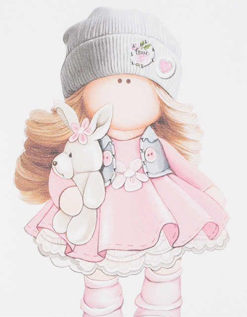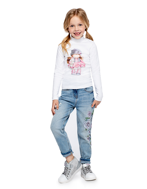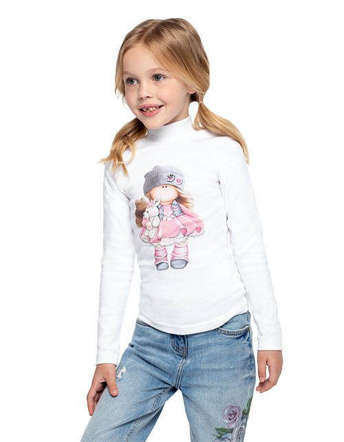 Джемпер для девочки с рисунком дополнен высоким воротником и стильным принтом в виде куклы. Изделие прямого силуэта с длинным рукавом выполнено из трикотажного полотна рибана, что обеспечивает приятные тактильные ощущения и износостойкость.