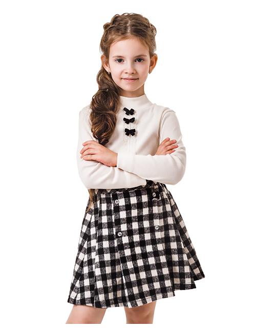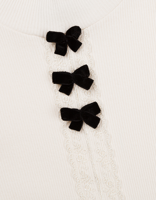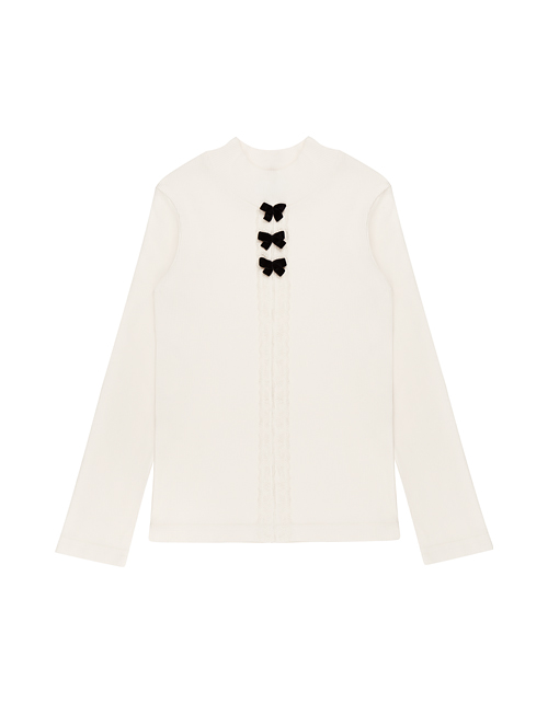 Стильная водолазка из фактурной ткани станет идеальной основой для модного повседневного образа. Яркие авторские детали украшают изделие и делают его особенным: контрастные черные бантики придают элегантность, а нежное кружево - утонченность.