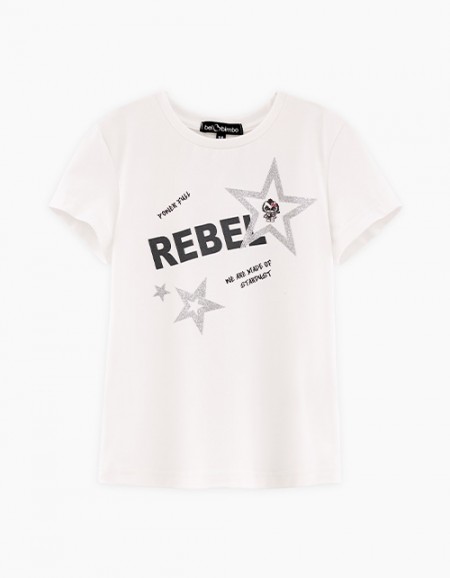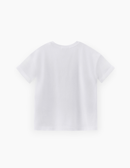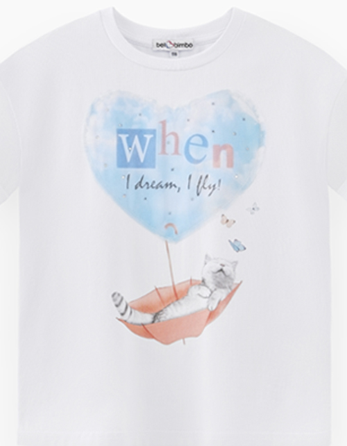 Авторская белая футболка для девочки. Модель прямого силуэта со спущенной линией плеча, с сетчатыми рукавами. Круглый вырез горловины. Изделие декорировано 3-d принтом, накрытым элементом из сеточки.