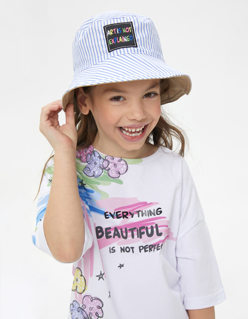 Белая футболка для девочки. Модель прямого силуэта со спущенной линией плеча. Круглый вырез горловины. Изделие ассиметричной формы - защип сбоку. Футболка из кулирной глади с цифровым принтом.