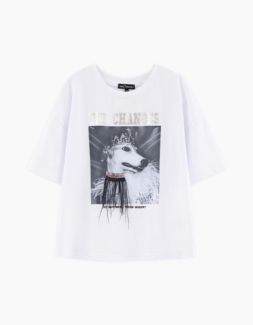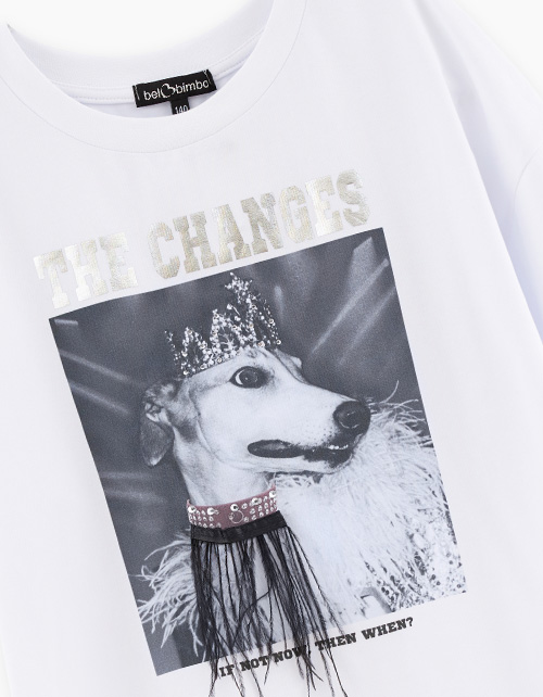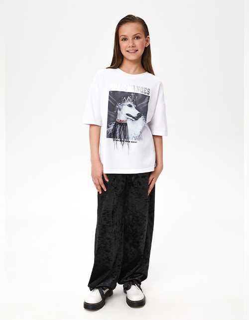 Стильная белая футболка для девочки. Модель прямого силуэта. Спущенная линия плеча. Футболка декорирована авторской трансферной печатью и декоративной лентой с перьями.