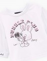 Белая футболка для девочки. Модель комфортного прямого силуэта. Рукава из мягкой сетки. Эластичная горловина. Футболка декорирована авторским принтом, розовыми стразами и серебряной плёнкой.