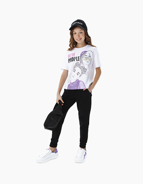 Стильная белая футболка объемного силуэта с круглой горловиной. Выполнена из кулирной глади с эластаном. Декорирована авторским принтом в стилистике капсулы, шрифтовым трансфером из цветной пленки и аппликацией из прозрачного пластика