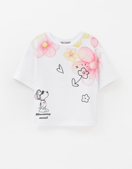 Дизайнерская белая футболка для девочки. Прямая укороченная модель. Спущенная линия плеча. Рукава из мягкого сетчатого материала. Эластичная горловина. Футболка с акцентным авторским принтом.
