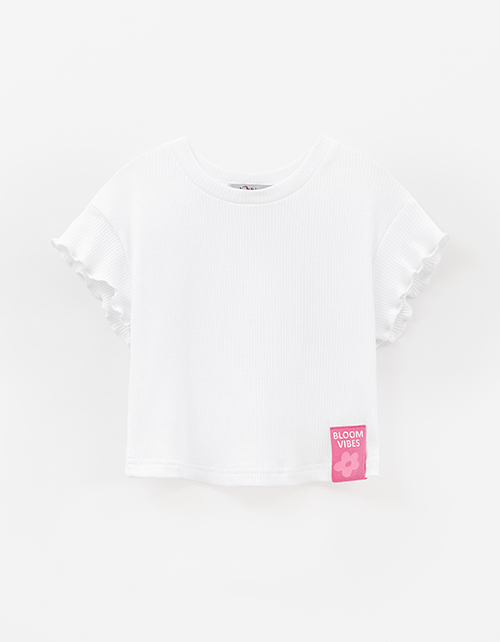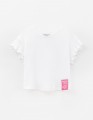 Белый топ из мягкого кашкорсе создаёт современный образ. Прямой крой и приспущенная линия плеча дают расслабленную посадку. Рукав-волан добавляет девичью лёгкость. Термоплёнка и нашивка из киперной тесьмы усиливают графичный характер модели.