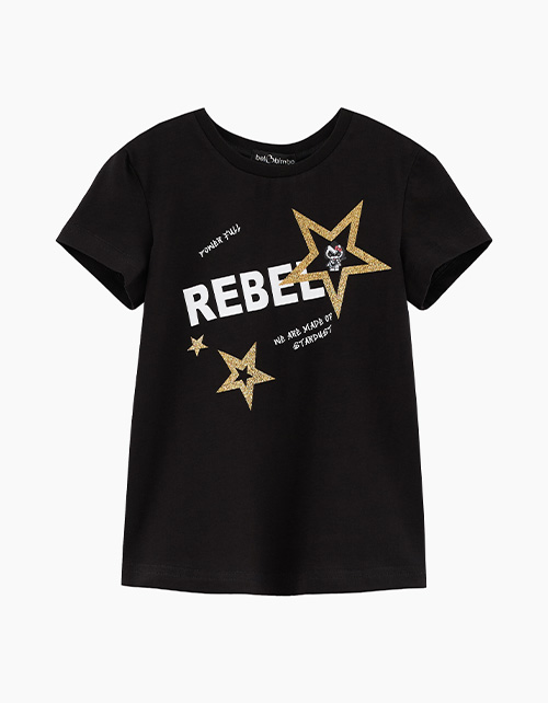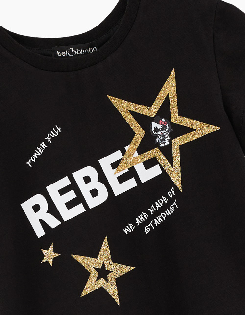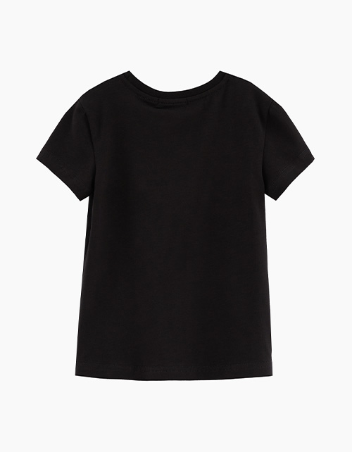 Чёрная футболка для девочки. Модель прямого силуэта. Горловина из эластичной рибаны. Футболка декорирована авторскими принтами.