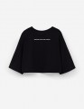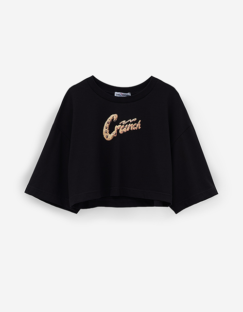 Чёрная укороченная футболка с oversize посадкой создаёт расслабленный, современный образ. Прямой крой остаётся удобным в движении. Принт с DTF и трансферной плёнкой добавляет выразительный акцент и подчёркивает характер модели.