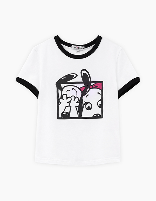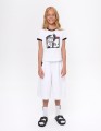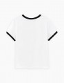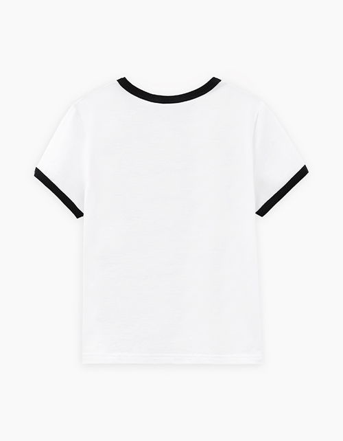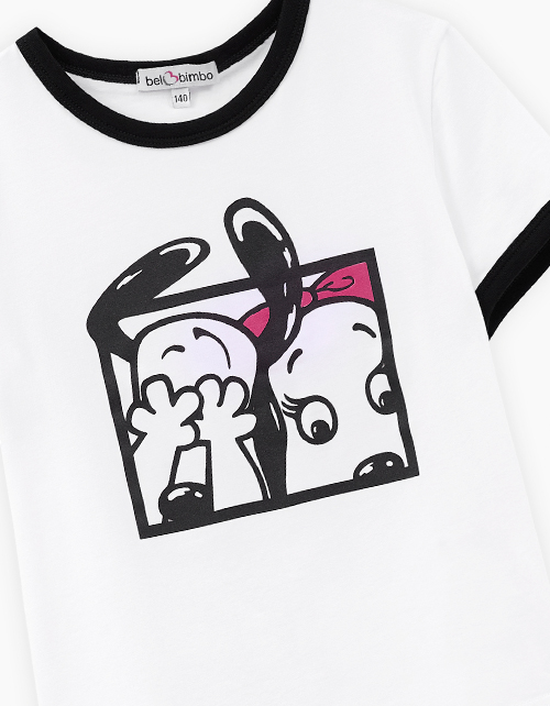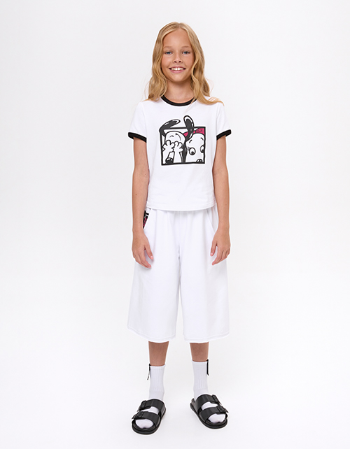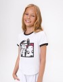 Белая футболка для девочки. Прямой силуэт обеспечивает комфорт. Эластичная горловина и манжеты оформлены контрастной отделкой, создающей графичный акцент. Принт с персонажами дополнен флоковой плёнкой - мягкой на ощупь и выразительной по фактуре.