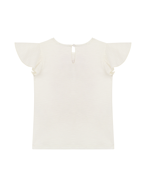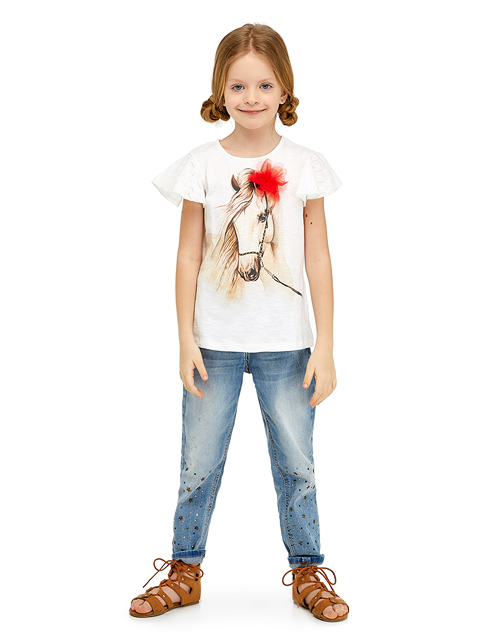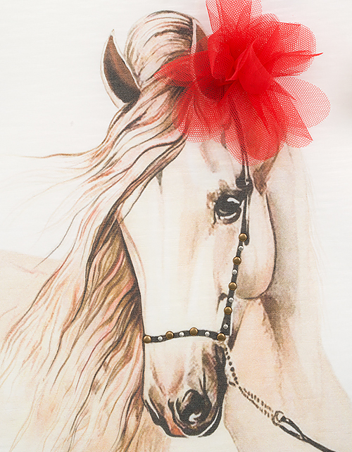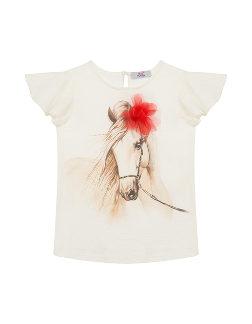 Прелестная комфортная маечка с изображением привлекательной лошадки с длинной гривой и объёмным ярким цветком, обязательно понравится маленькой леди. Кокетливые рюши на рукавах очаровывают своей воздушностью. Нежная ткань подарит ощущение мягкости и свобо