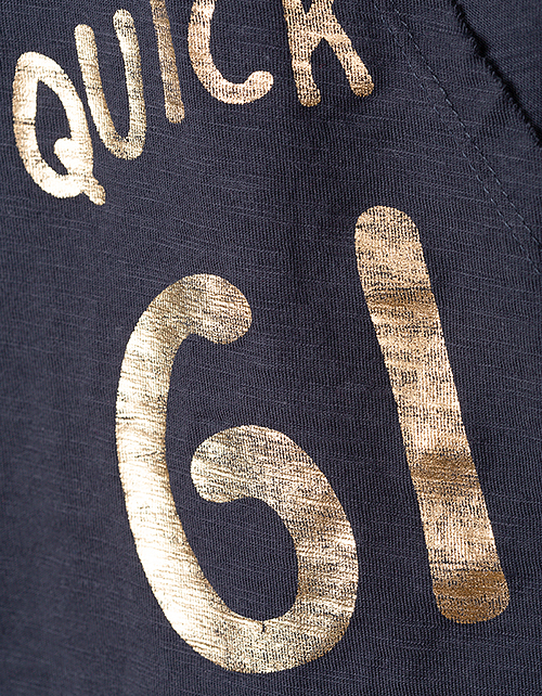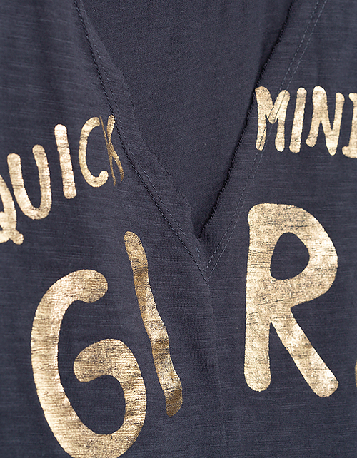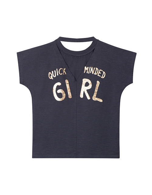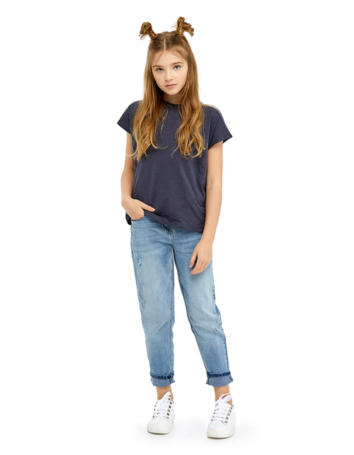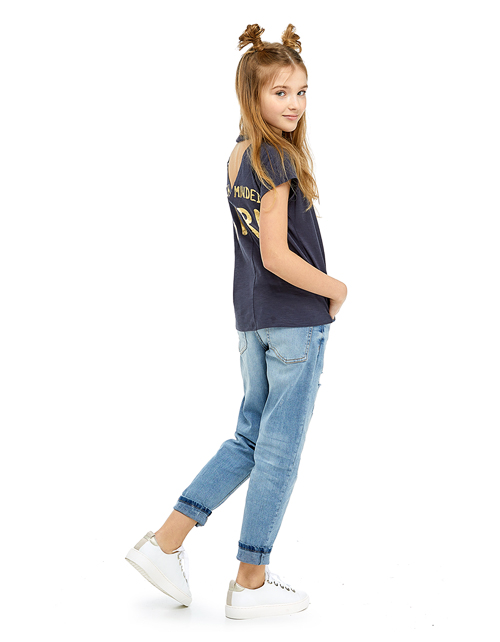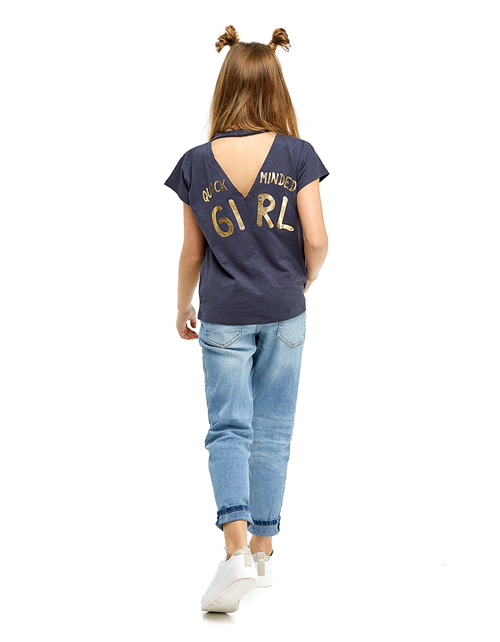 Стильная футболка свободной формы выполнена из комфортной натуральной ткани. Ультрамодный разрез на спинке и сияющая золотистая надпись делают модель яркой и оригинальной. Эксклюзивный дизайн подчёркивает индивидуальность девочки