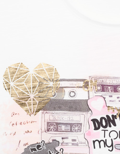 Футболка с оригинальным принтом в стиле фотоколлажа, сделает образ ярким и позволит девочке почувствовать свою уникальность! Нежные оттенки и золотые элементы придают дизайну эффектность. Мягкая ткань подарит ощущение непринуждённости и комфорта