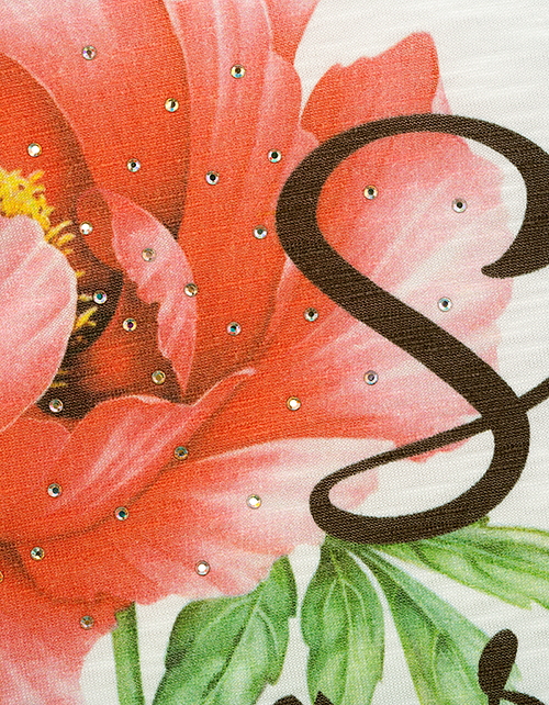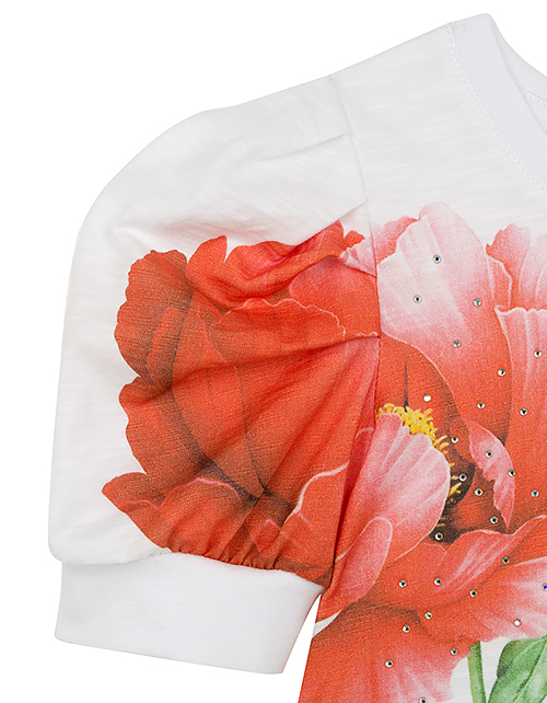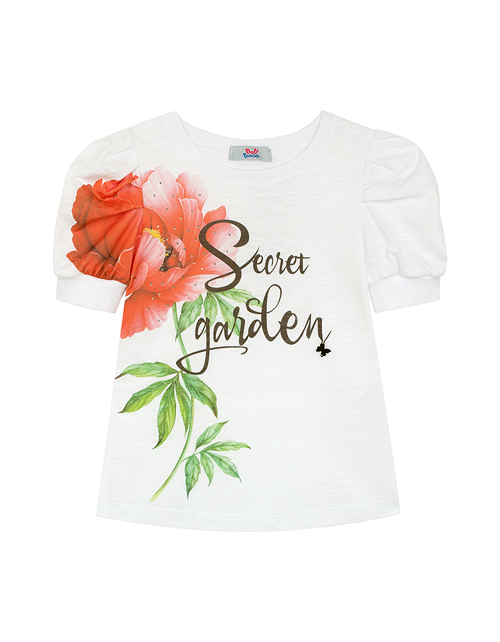Прелестная кофточка обладает невероятным эффектом: в ней Ваша девочка будет самой неотразимой! Восхитительный принт с яркими цветами, украшенными переливающимися стразами, модные в этом сезоне объемные плечи и надпись "Тайный сад" придают образу загадку