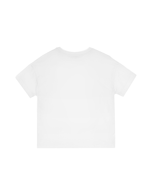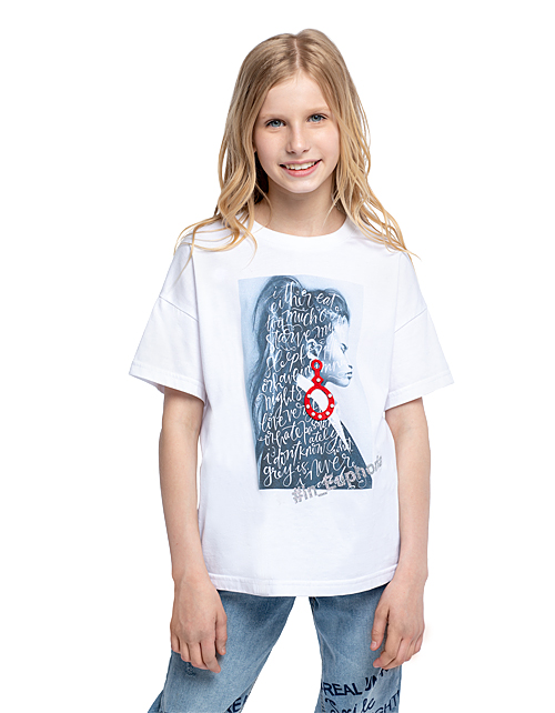Белая футболка для девочки с рисунком имеет свободный силуэт и широкие короткие рукава для повышенного комфорта в жаркие дни. Выразительный принт с девушкой является главным дизайнерским акцентом, а короткая длина поддерживает ультрамодный дизайн.