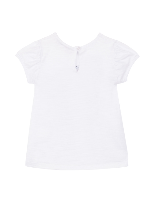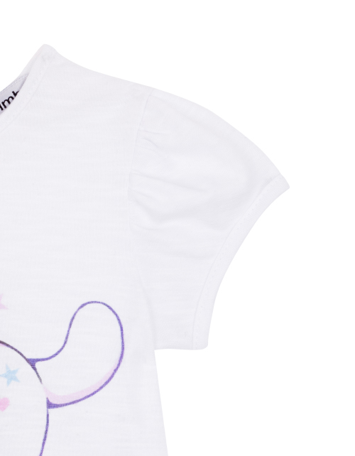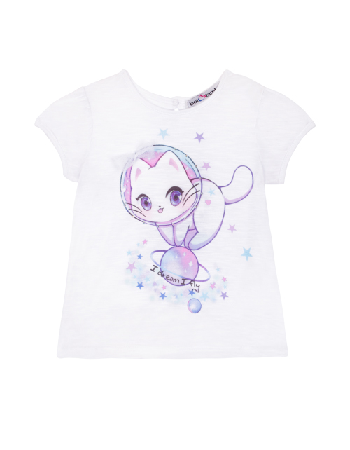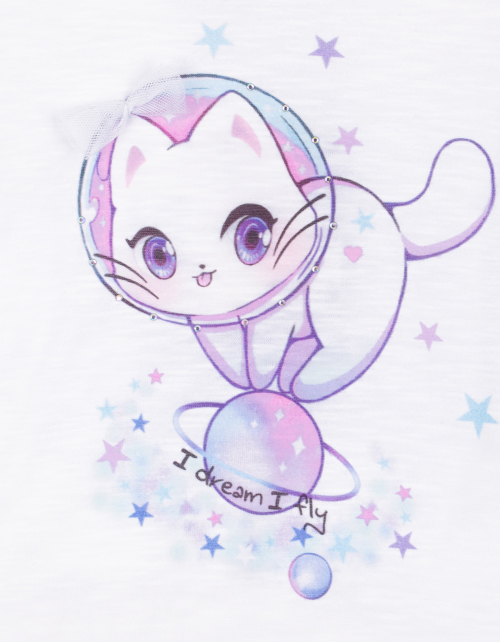 Повседневная белая футболка для девочки с ярким принтом космической тематики. Декоративные стразы на лицевой стороне. Рукава-фонарики. Функциональная застежка на пуговице на спинке.