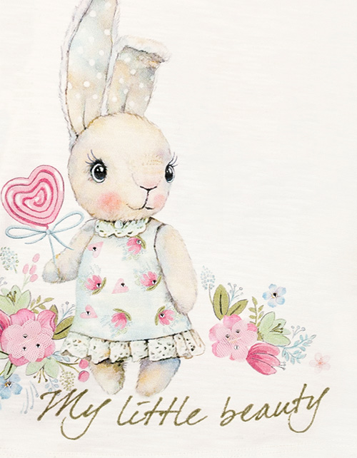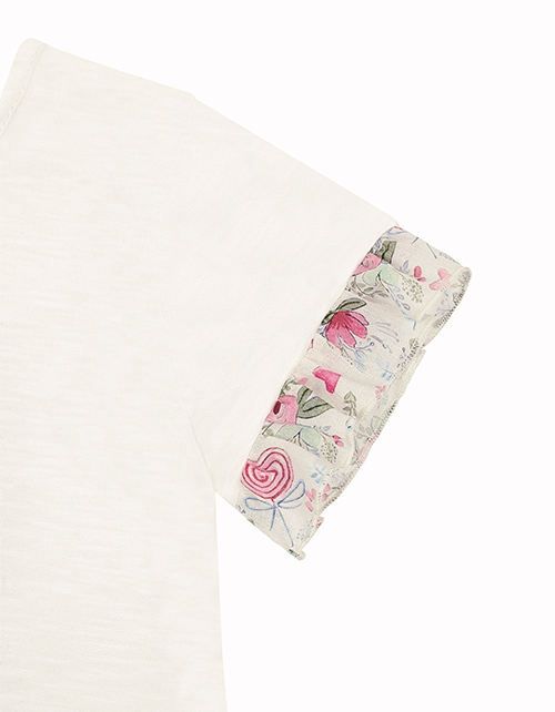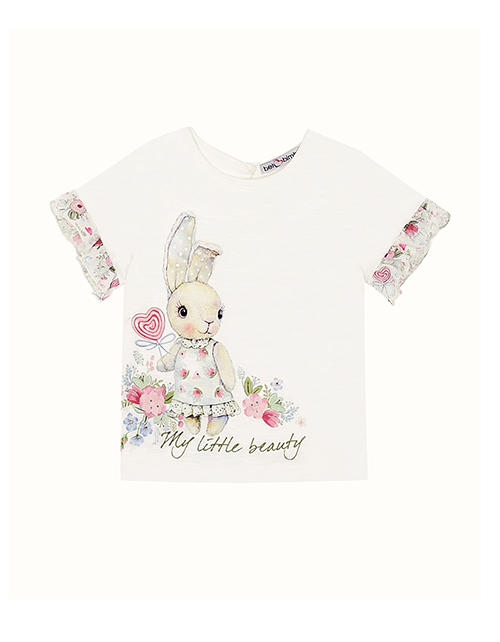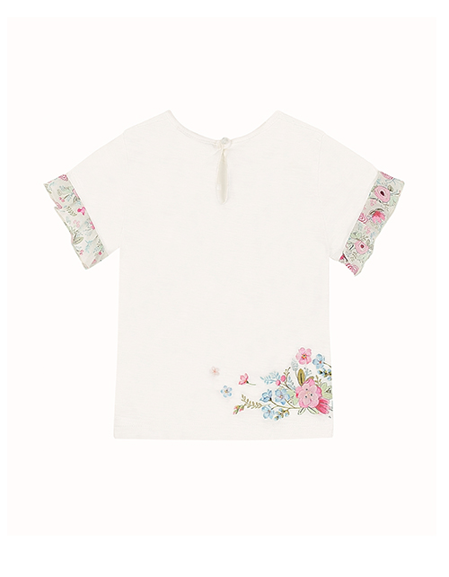 Молочная футболка для девочки. Рукава с оборками. Функциональная застежка на пуговице на спинке. Оформление в стилистике капсулы "Незабудка".