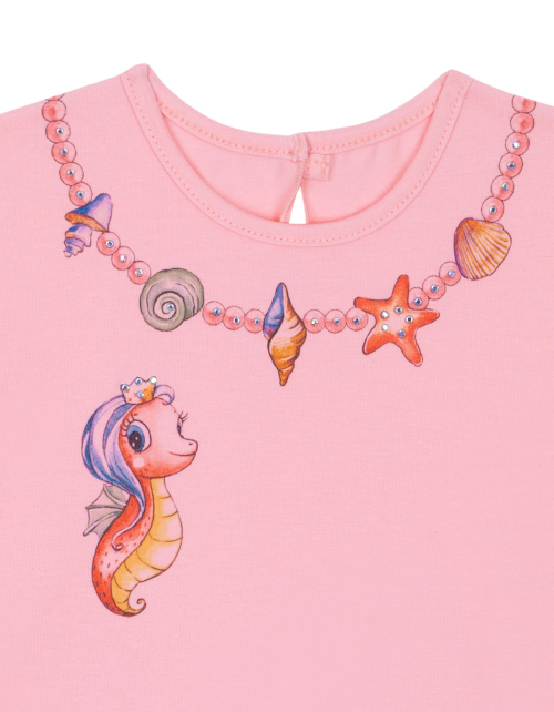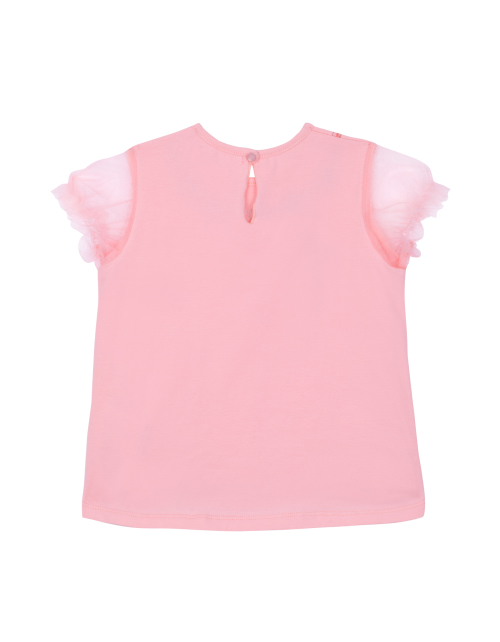Футболка для девочки цвета светлый коралл. Дизайнерское оформление в стилистике капсулы "Ариэлла", дополненное стразами. Рукава из сетчатого полотна с оборками на концах. Функциональная застежка на пуговице.