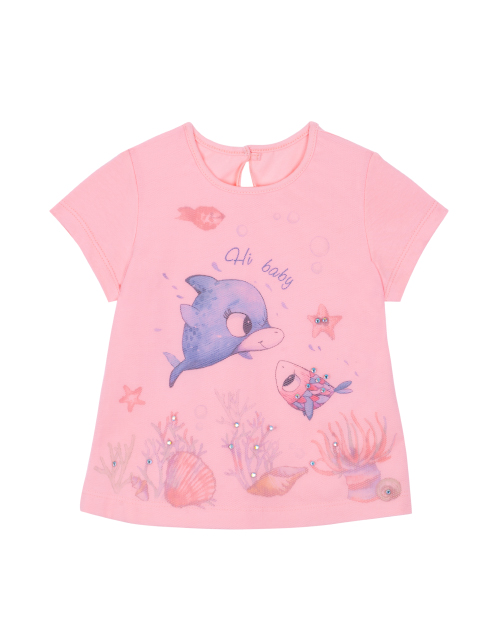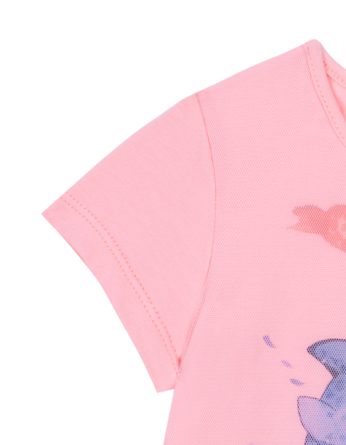 Футболка для девочки цвета светлый коралл. Принты дизайнерской тематики "Ариэлла". Декоративное сетчатое полотно украшено стразами. Функциональная застежка на пуговице на спинке.