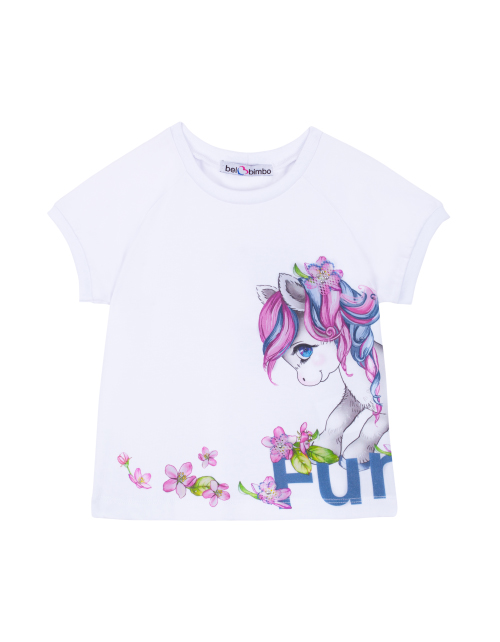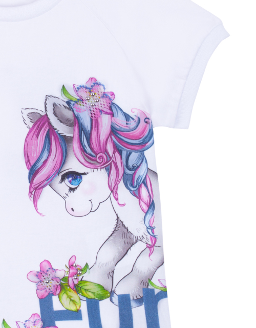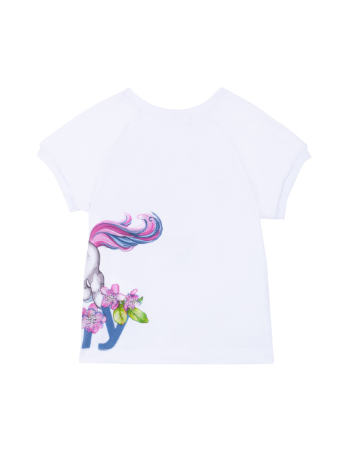 Нарядная белая футболка для девочки прямого силуэта с коротким рукавом и круглым вырезом горловины. Дизайнерский принт на лицевой стороне и спинке.