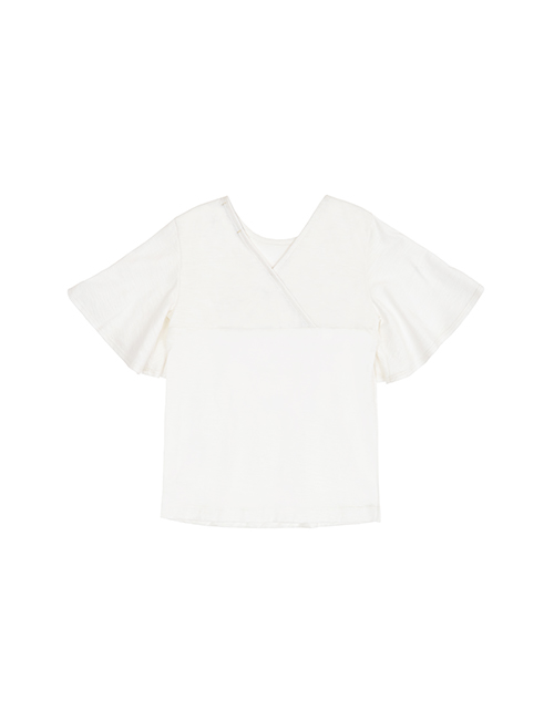 Повседневная белая футболка для девочки. Изделие дополнено трапециевидными рукавами и ярким принтом на лицевой стороне. Горловина круглая в передней части и v-образная на спинке.