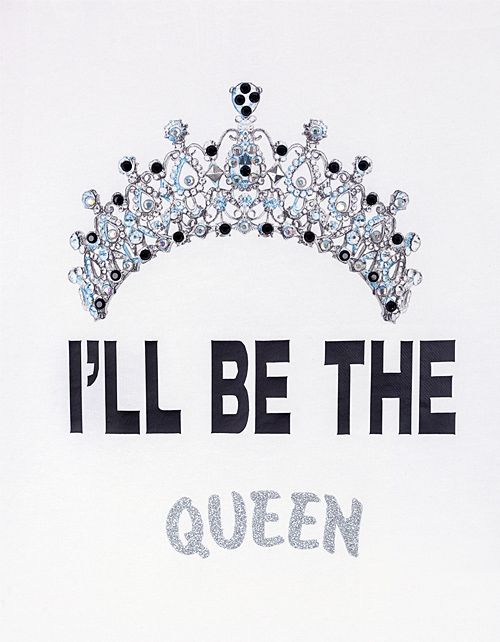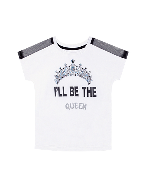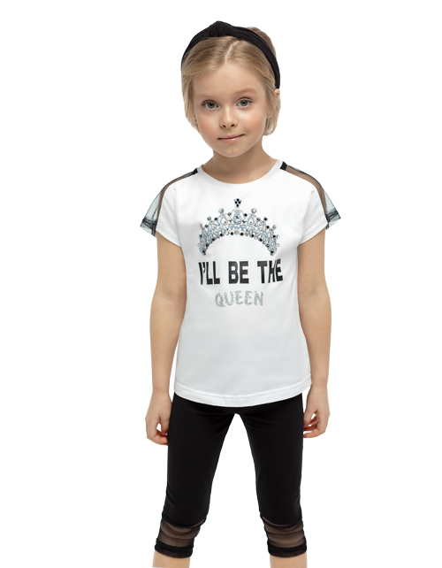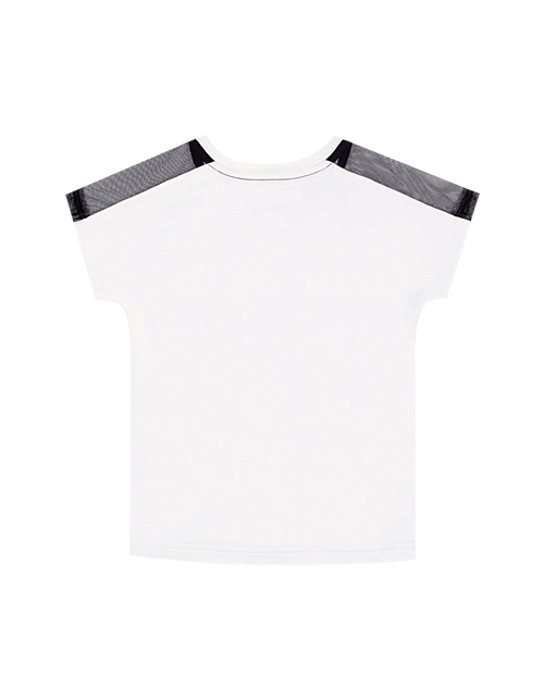 Белая футболка для девочки с круглым вырезом горловины. Дизайнерское оформление в стилистике капсулы "Модная тусовка" с вышивкой и стразами. Декоративные вставки из сетчатого полотна на плечах.