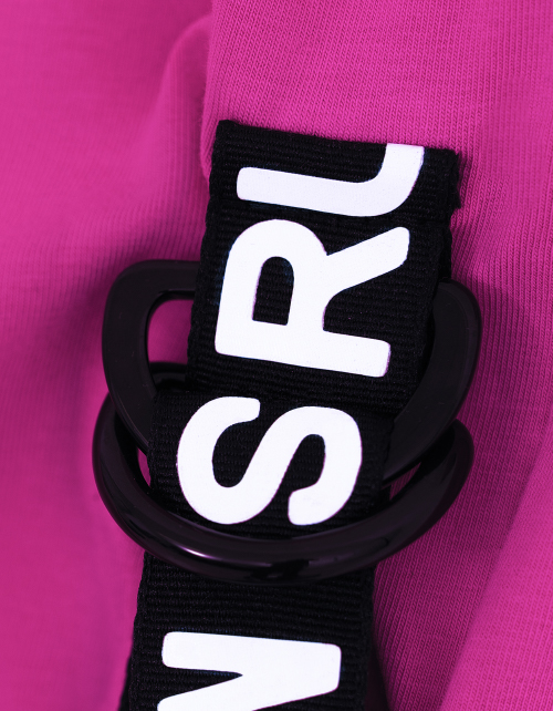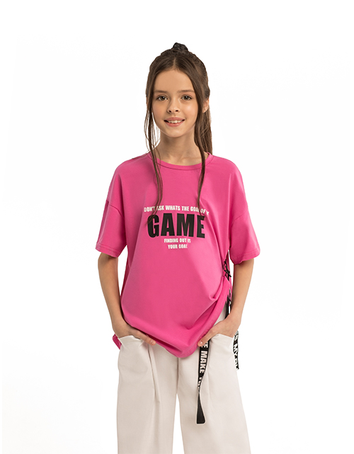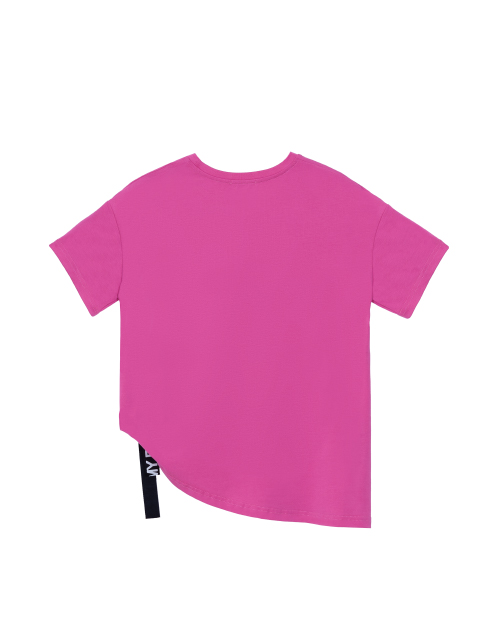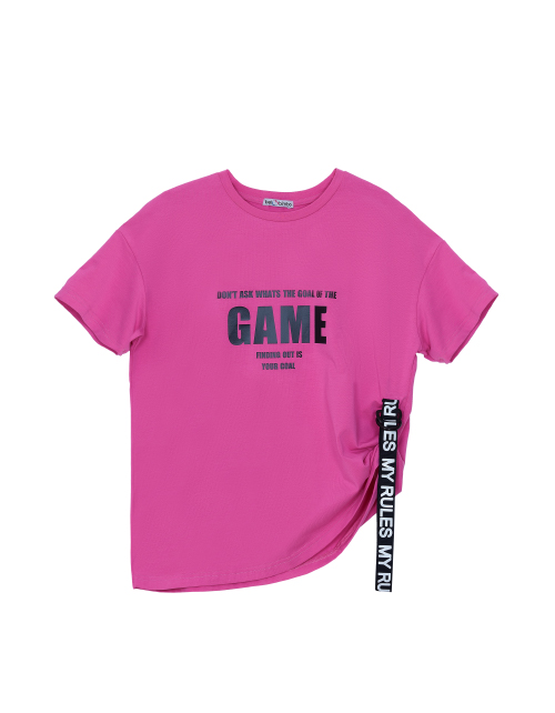 Розовая футболка для девочки с круглым вырезом горловины. Принт-надпись в стилистике капсулы "На своей волне". Декоративный элемент в нижней части изделия.