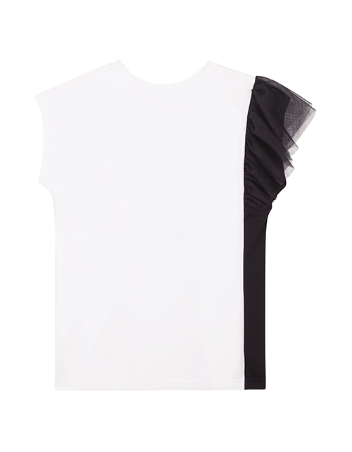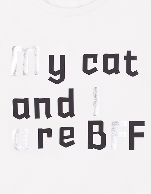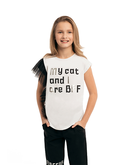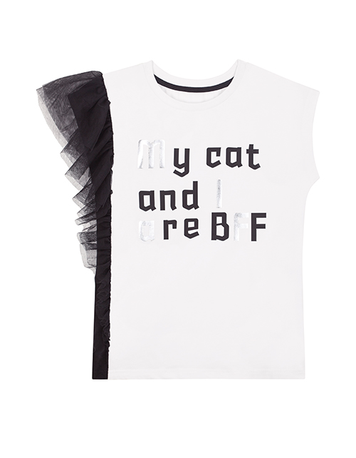 Белая футбола для девочки с укороченным рукавом и круглым вырезом горловины. Декоративная вставка из сетчатого полотна. Принт-надпись в стилистике капсулы "Кот-Арт".