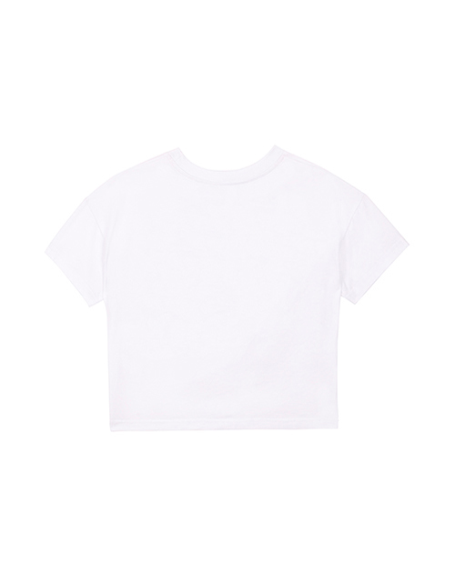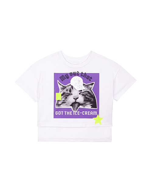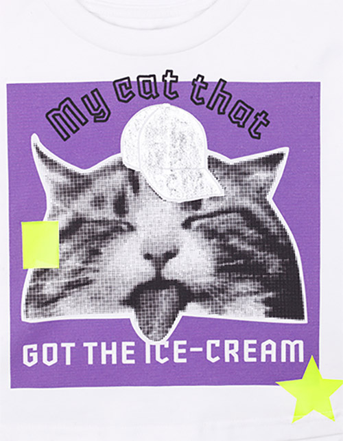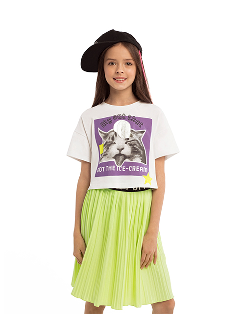 Белая футболка для девочки с круглым вырезом горловины. Дизайнерское оформление в стилистике капсулы "Кот-Арт". Удлиненная спинка.