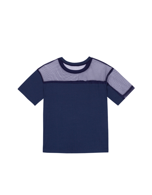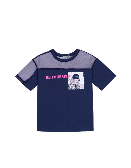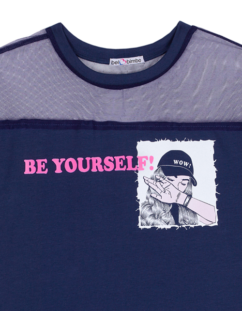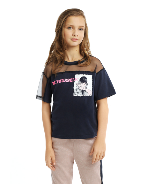 Темно-синяя футболка для девочки с круглым вырезом горловины. Декоративная вставка из сетчатого полотна. Дизайнерское оформление в стилистике капсулы "Миллион лайков".