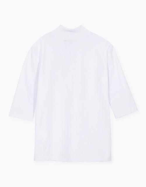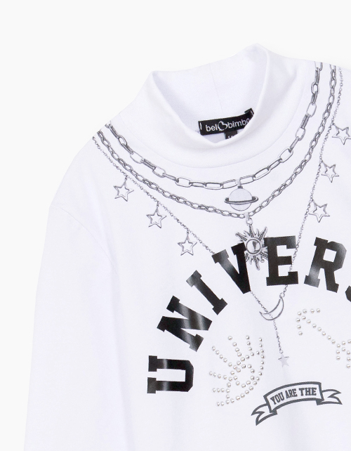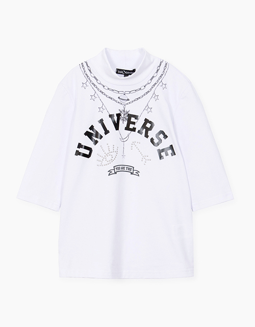 Белая футболка комфортного прямого силуэта. Рукав до локтя. Воротник-стойка из рибаны. Изделие без застёжки. В качестве декора - трансферы из страз (око, стрелка). Шрифтовой принт.