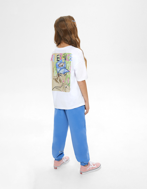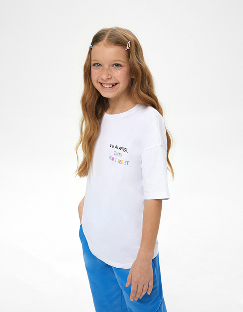 Стильная белая футболка для девочки. Круглый вырез горловины. Модель прямого силуэта со спущенной линией плеча. Принт на спинке.