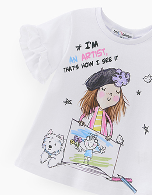 Стильная белая футболка для девочки. Модель прямого силуэта со спущенной линией плеча. Рюши по низу рукава. Круглый вырез горловины. Футболка декорирована авторским принтом.
