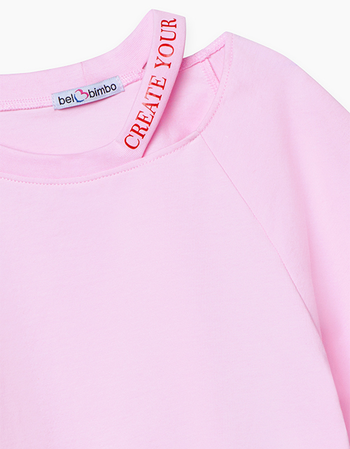 Укороченный топ модного свободного силуэта с разрезом по линии горловины. Выполнен из светло-розовой кулирной глади. Горловина отделана рибаной в тон и декорирована контрастным шрифтовым принтом Create your mood ("Создай свое настроение")