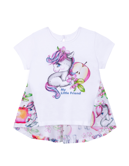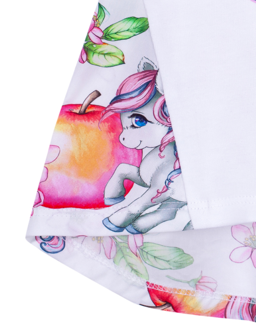 Нарядная туника для девочки а-силуэта. Изделие с коротким рукавом и круглым вырезом горловины украшено принтом на передней части. Туника дополнена отделкой из плательной ткани с рисунком.