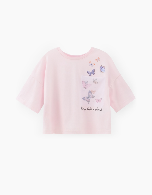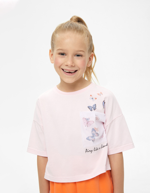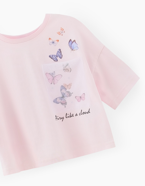 Укороченная светло-розовая футболка для девочки. Модель OVERSIZE прямого силуэта. Изделие с декоративным карманом из сетки, дополненным вылетающими бабочками. Футболка декорирована стразами.