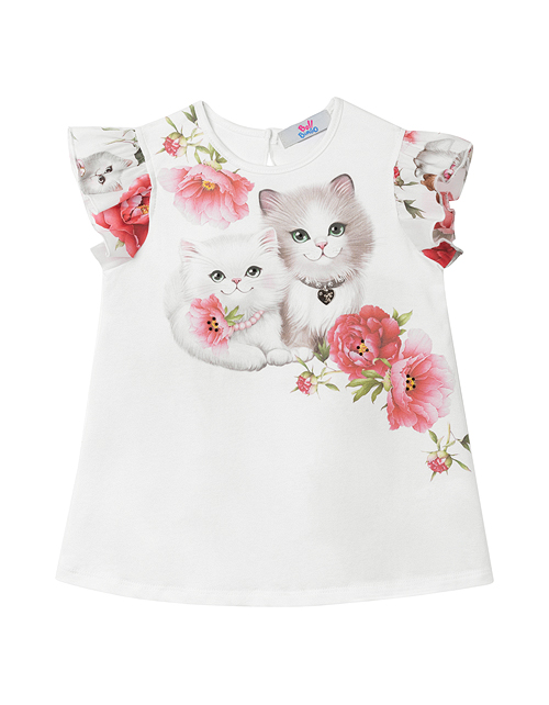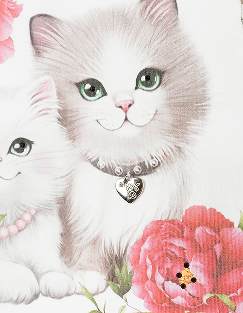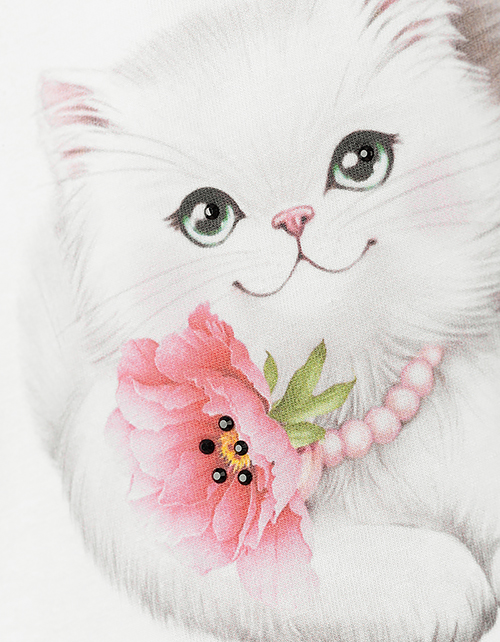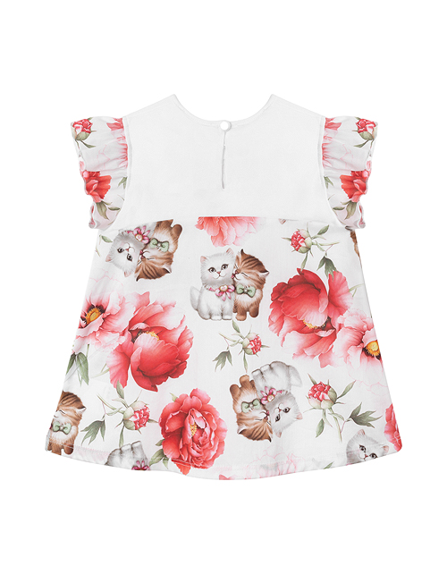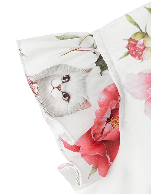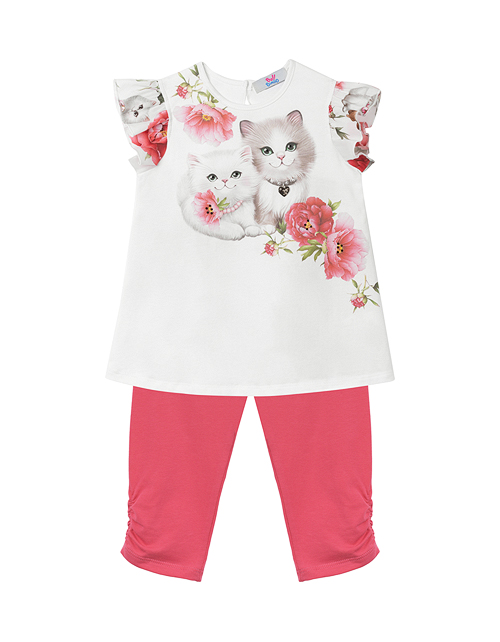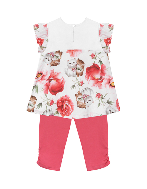Самый очаровательный и комфортный комплект для Вашей красавицы! Мягкая ткань дарит подлинную нежность и заботу. Прелестная кофточка с воздушными оборками на плечиках и принтом с изображением котят и восхитительных цветов, смотрится просто изумительно