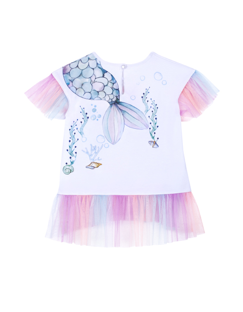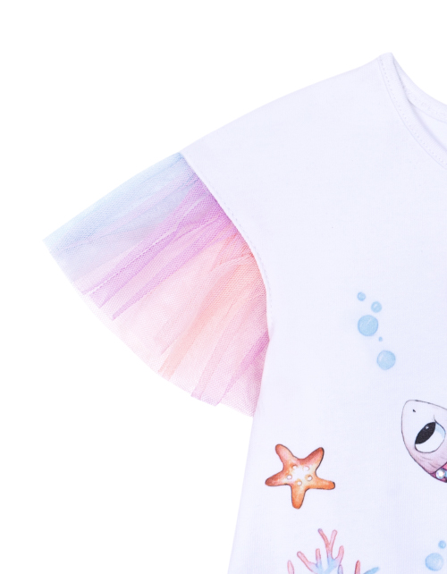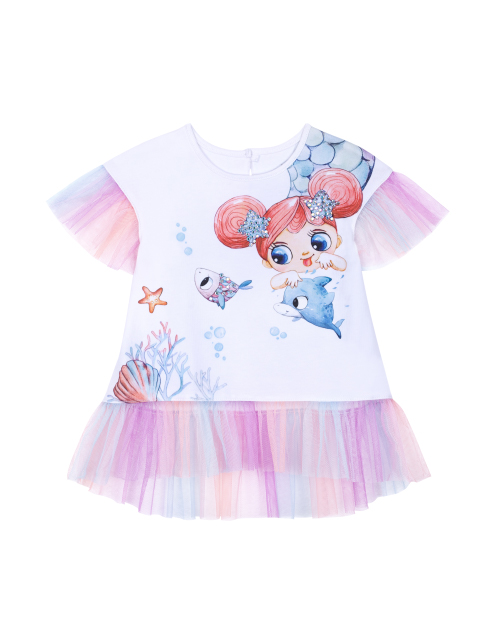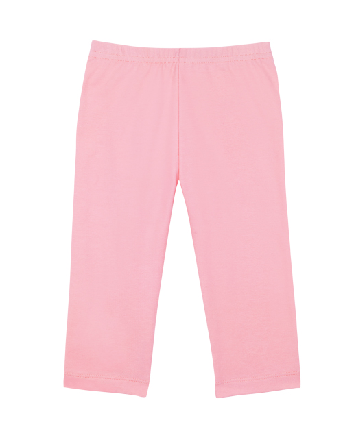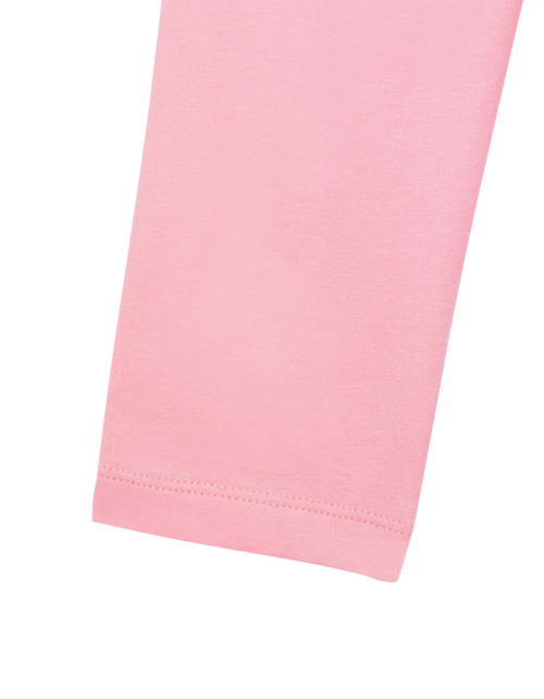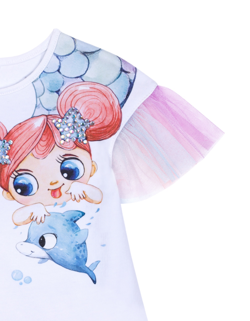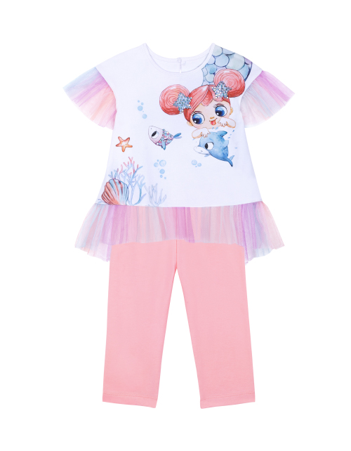Комплект для девочки из розовых брюк и футболки. Рукава и низ футболки декорированы сетчатым полотном. Принт в стилистике капсулы "Ариэлла" дополнен стразами. Застежка на пуговице. Розовые бриджи на резинке.